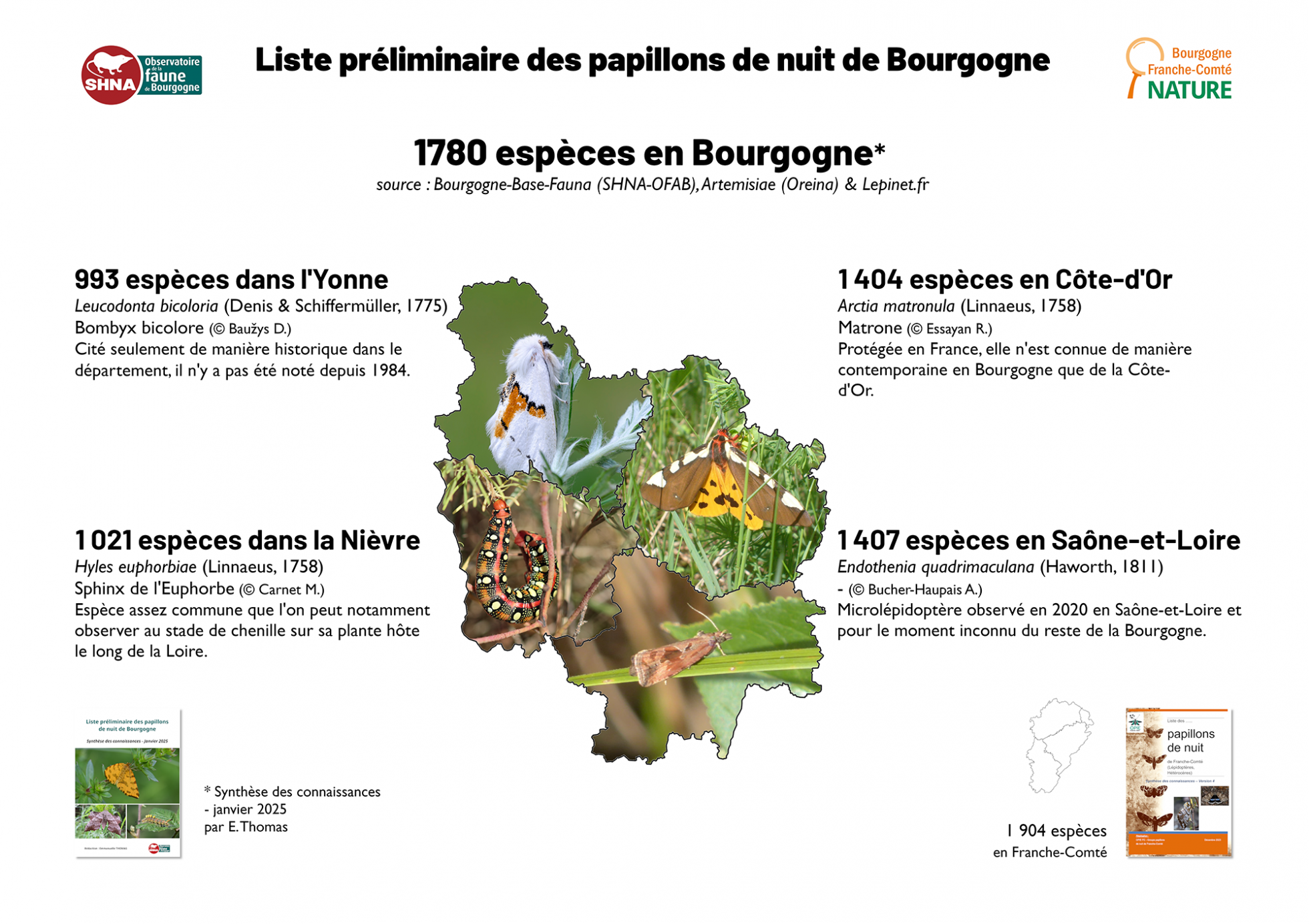 En janvier 2025, Emmanuelle Thomas, membre active du Groupe Invertébrés de Bourgogne (GIB), a réalisé un important travail de synthèse à partir des données issues de la Bourgogne Base Fauna (BBF) administrée par la SHNA-OFAB, de la base de donnée d’Oreina (Artemisiae) et du site Lepinet.fr : la liste préliminaire des papillons de nuit de Bourgogne. Un travail entièrement bénévole que nous saluons et remercions pour son engagement au service de la connaissance de la faune régionale.